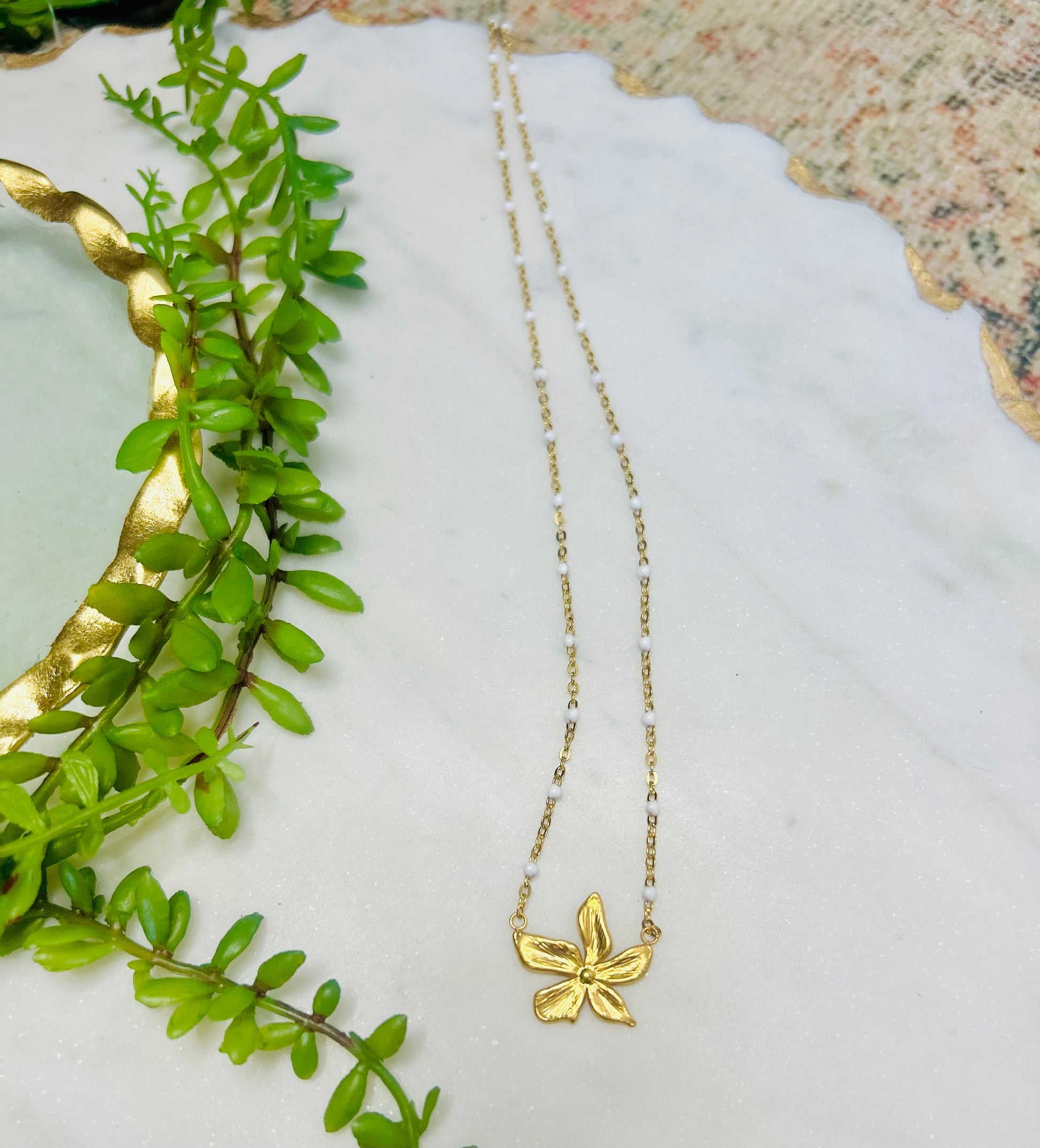 This super cute Abbi Flower Necklace is sure to be a great addition to your wardrobe! The dainty white enamel satellite chain is accented with a fun little flower drop pendant. This cutie can be worn dressed up or even worn with a simple tee & mom jeans!