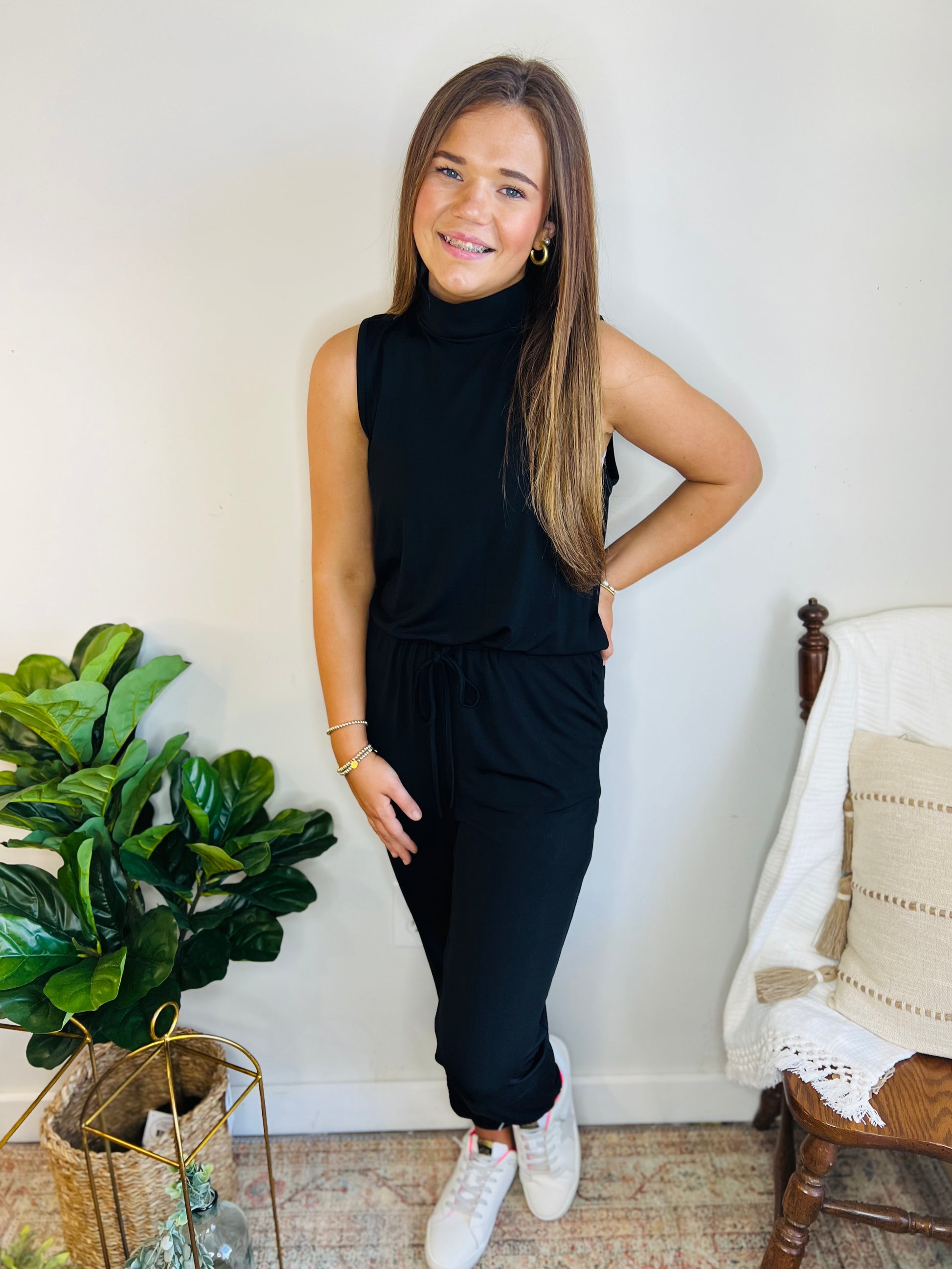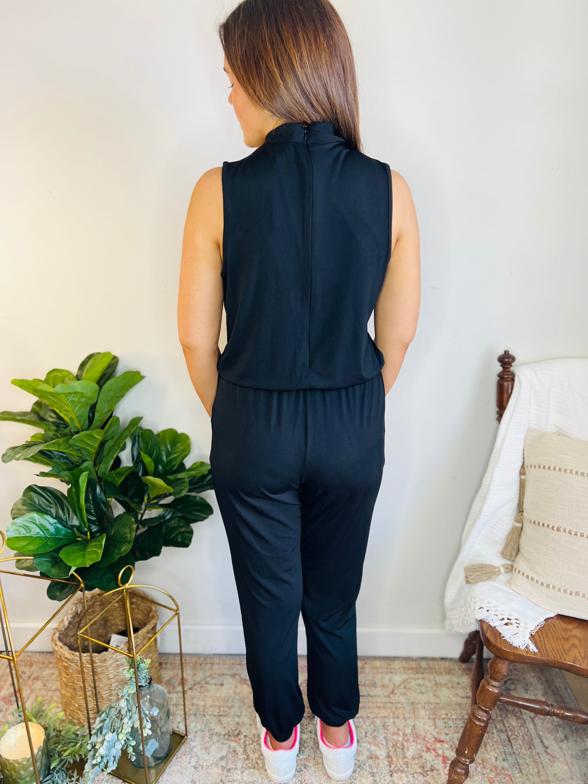 This black jumpsuit can completely transform from casual and athletic, to dressy and elegant! Tennies and sneakers dress it down, but the right heals and jewelry take it to another level. Throw on a blazer and it’s everything you want in a work fit! The solid black, neck-to-ankle silhouette is extremely flattering. Who knew something so comfy could look this good!