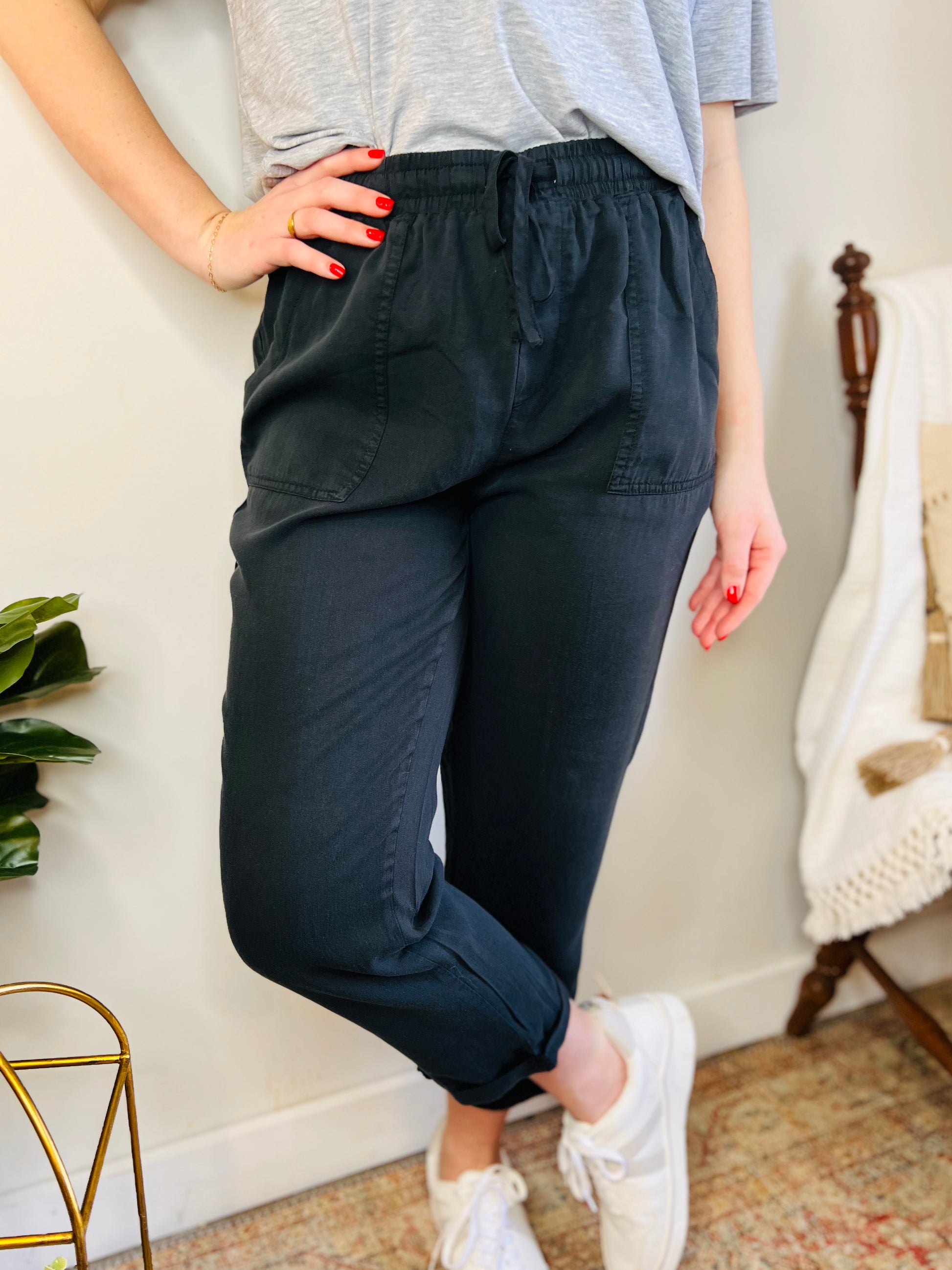 Linen is one of our favorite fabrics! It elevates any garment and gives it a classy look. These cropped, black linen joggers will take your casual outfit up a notch, while giving you the level of comfort you would find in loungewear. Pair them with sneakers and tees for an everyday fit, or mules and your favorite blouse to dress them up. These pants feature pockets in front and back, an elastic waist with functioning drawstring, and a cuffed hem.