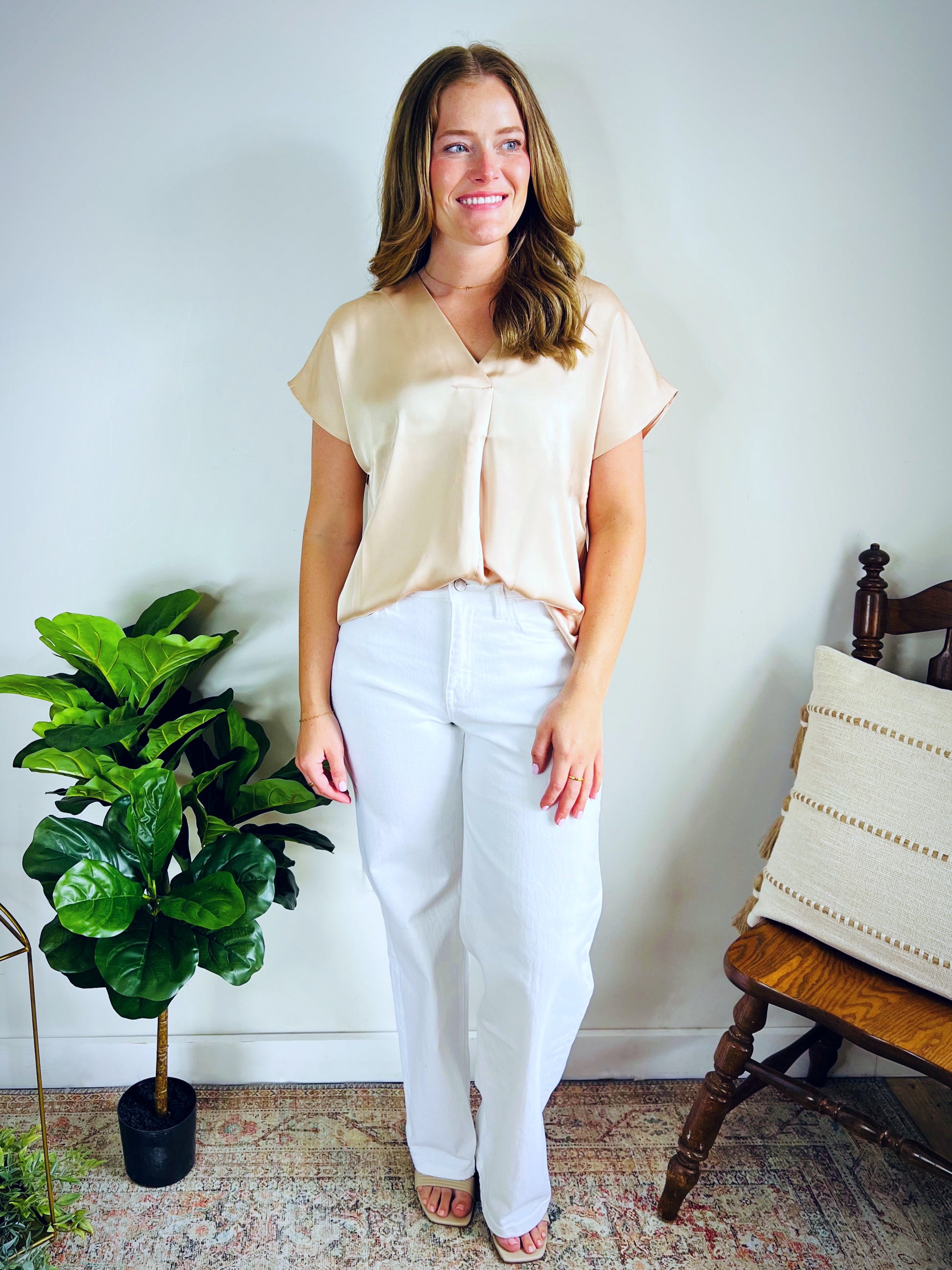 This champagne colored satin top is the perfect classy staple to add to your wardrobe. Pair it with white for an elevated daytime outfit, layer it under a blazer for work, or dress it up for an elegant evening look.