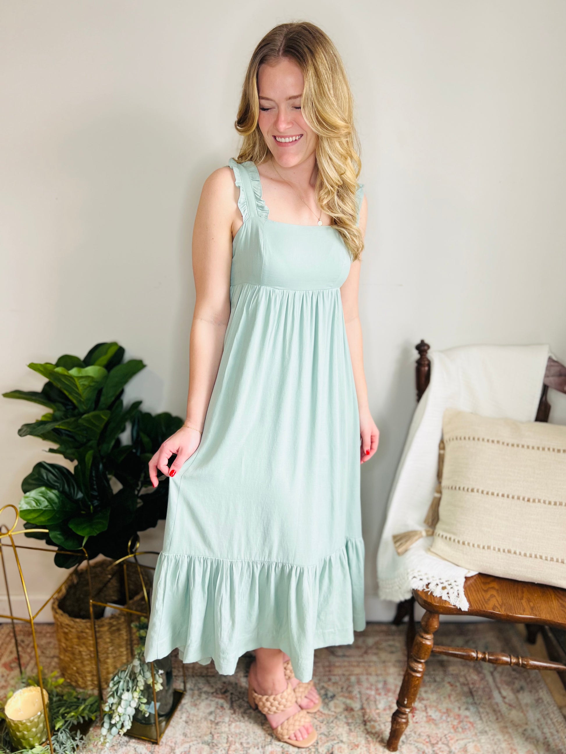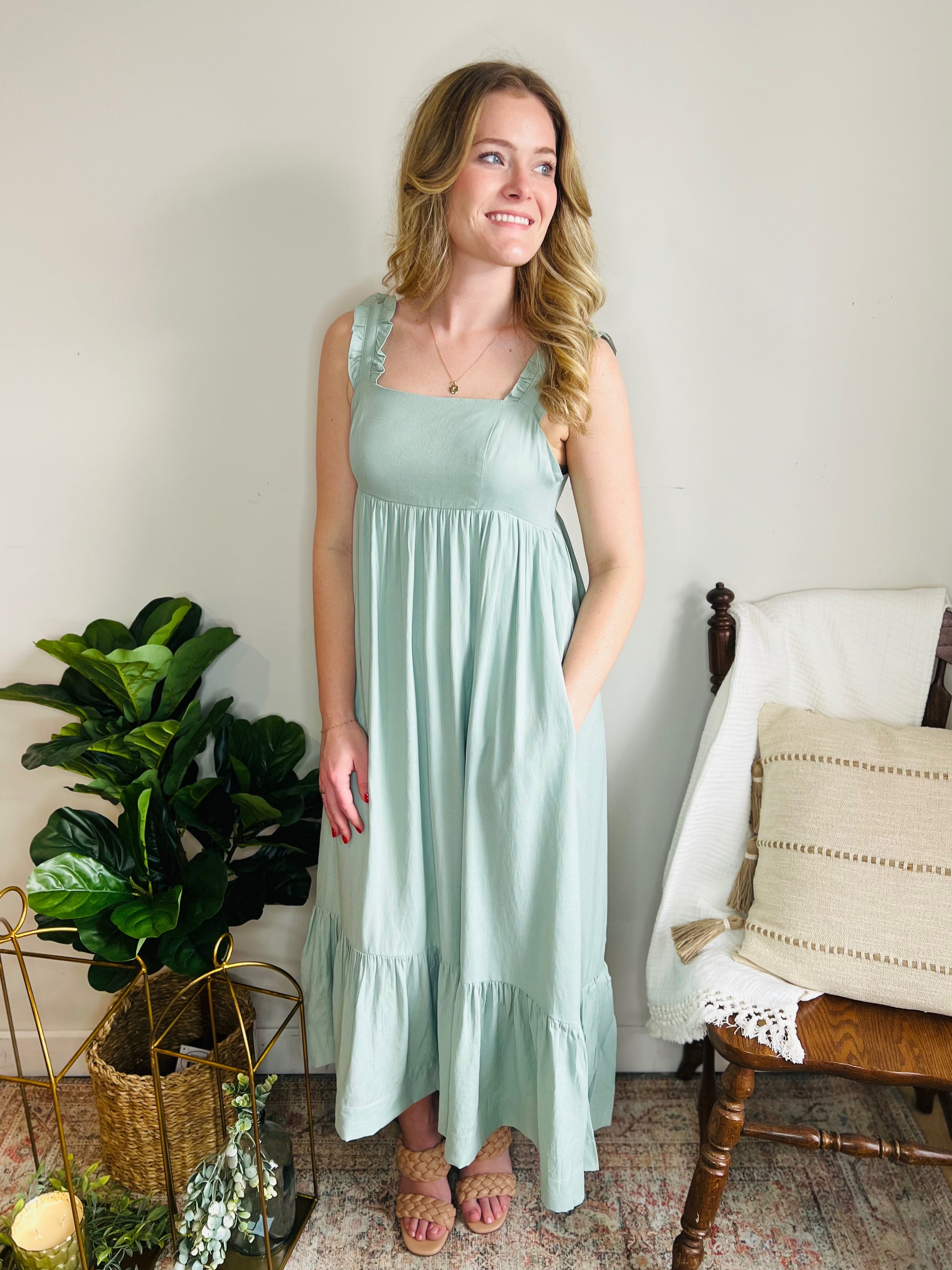 This beautiful dress is the perfect addition to your spring and summer wardrobe. The material has a fun, flowy feel, giving movement and flare. Ruffled straps create visual interest near your face, while they adjust in the back with pretty, wooden buttons. The straps can be worn straight, or crisscrossed for extra style and function.
