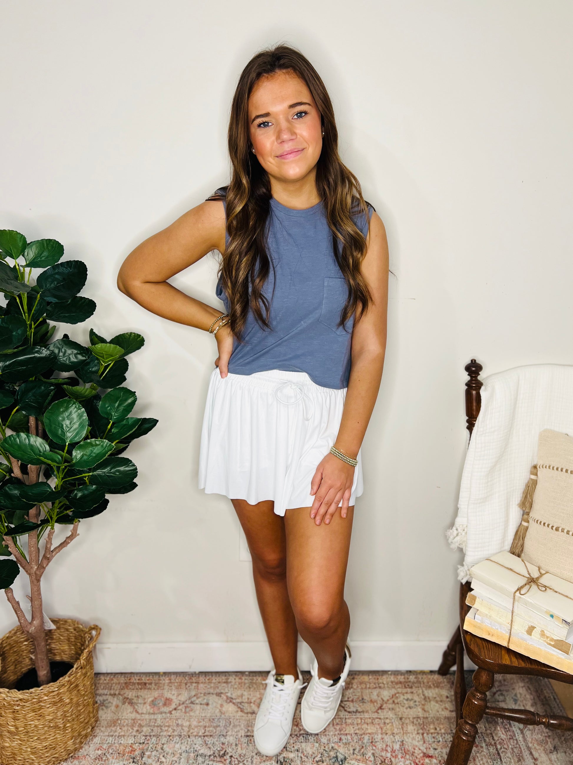 This dusty blue, lightweight, cotton tank is so versatile! Perfect for layering, or pairing with your favorite shorts, pants or activewear.