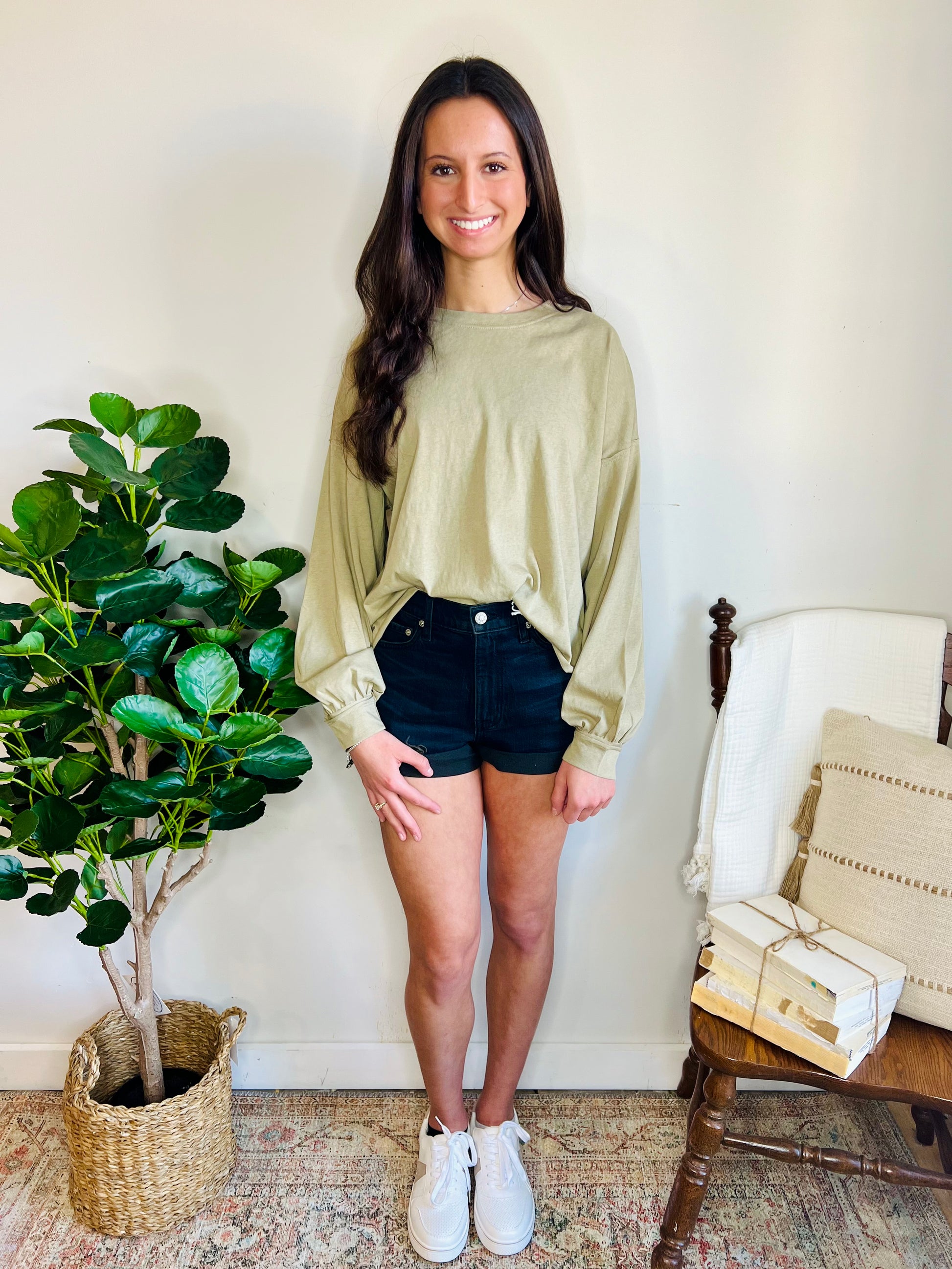 This simple long sleeve top is thin & lightweight, making it a great staple to wear with pants or shorts year-round!