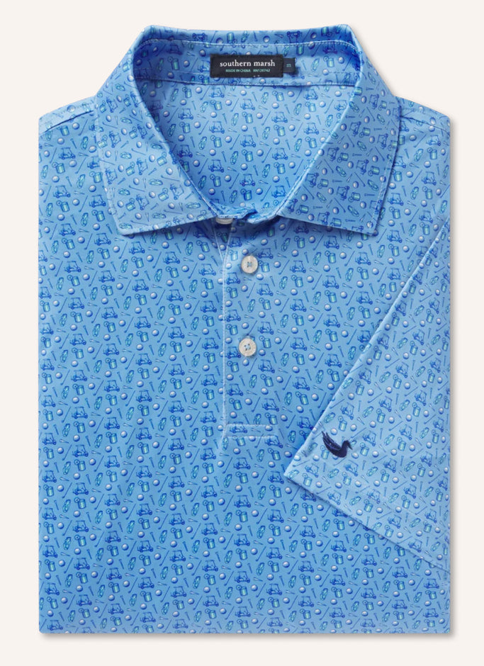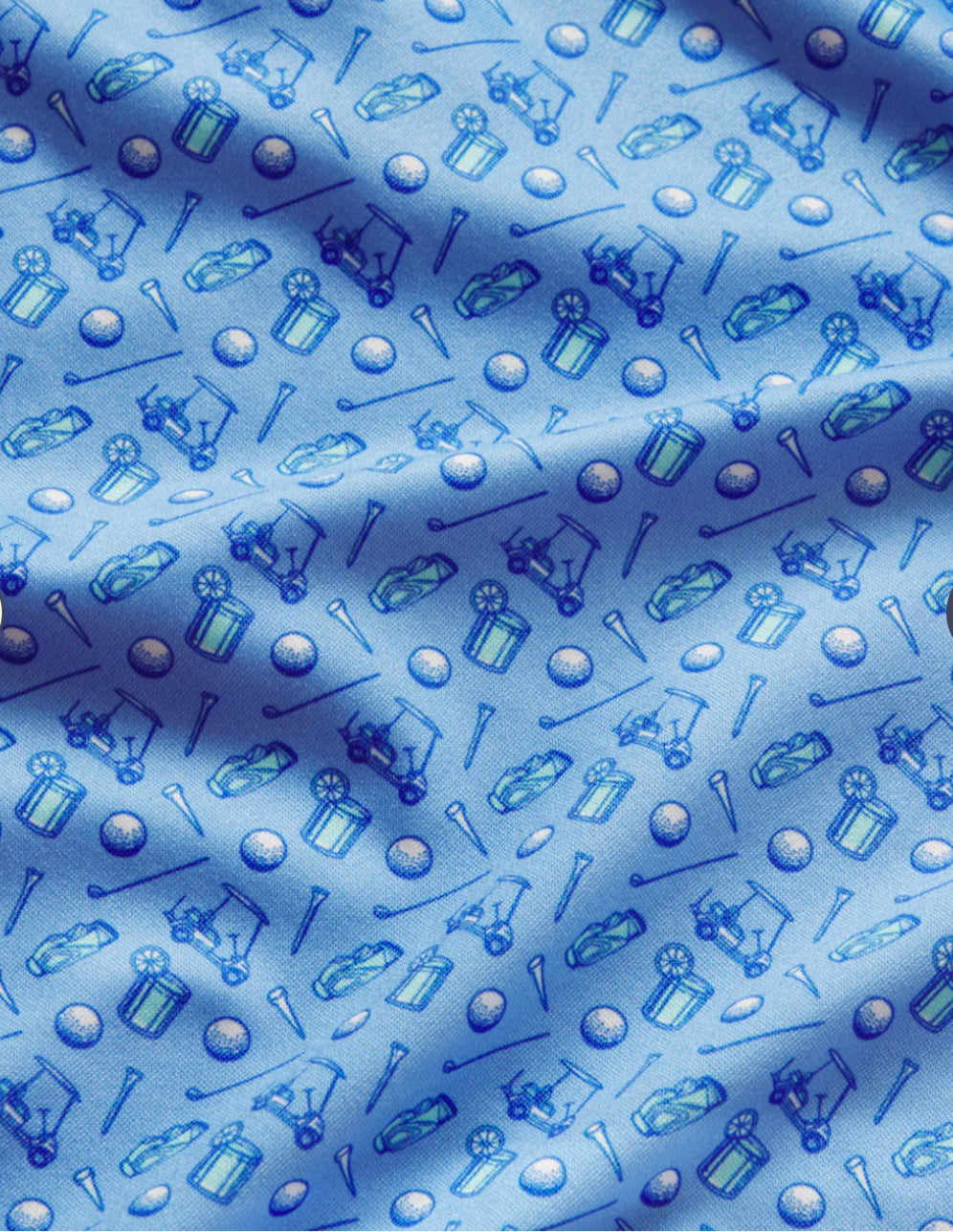 Perfect for a day out on the links, this Performance Polo blends lightweight comfort with playful style, featuring an all-over micro print of golf carts, clubs, balls, and tees. Designed with a three-button placket and soft, moisture-wicking fabric, it keeps you cool and comfortable on warm spring and summer days. Perfect for the golf course, the office, or outings, it’s finished with our signature duck logo on the sleeve for a refined touch.
