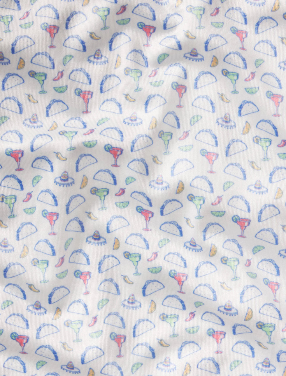 Celebrate Taco Tuesday any day with this Flyline Performance Polo. Featuring a playful micro print of tacos, margaritas, limes, and jalapeños, this lightweight, moisture-wicking polo keeps you cool and comfortable. Perfect for the golf course, casual outings, or even the office, it offers 4-way stretch and a classic three-button placket. Finished with the SM signature duck logo on the chest, this polo brings a fun, festive vibe to your spring and summer wardrobe.