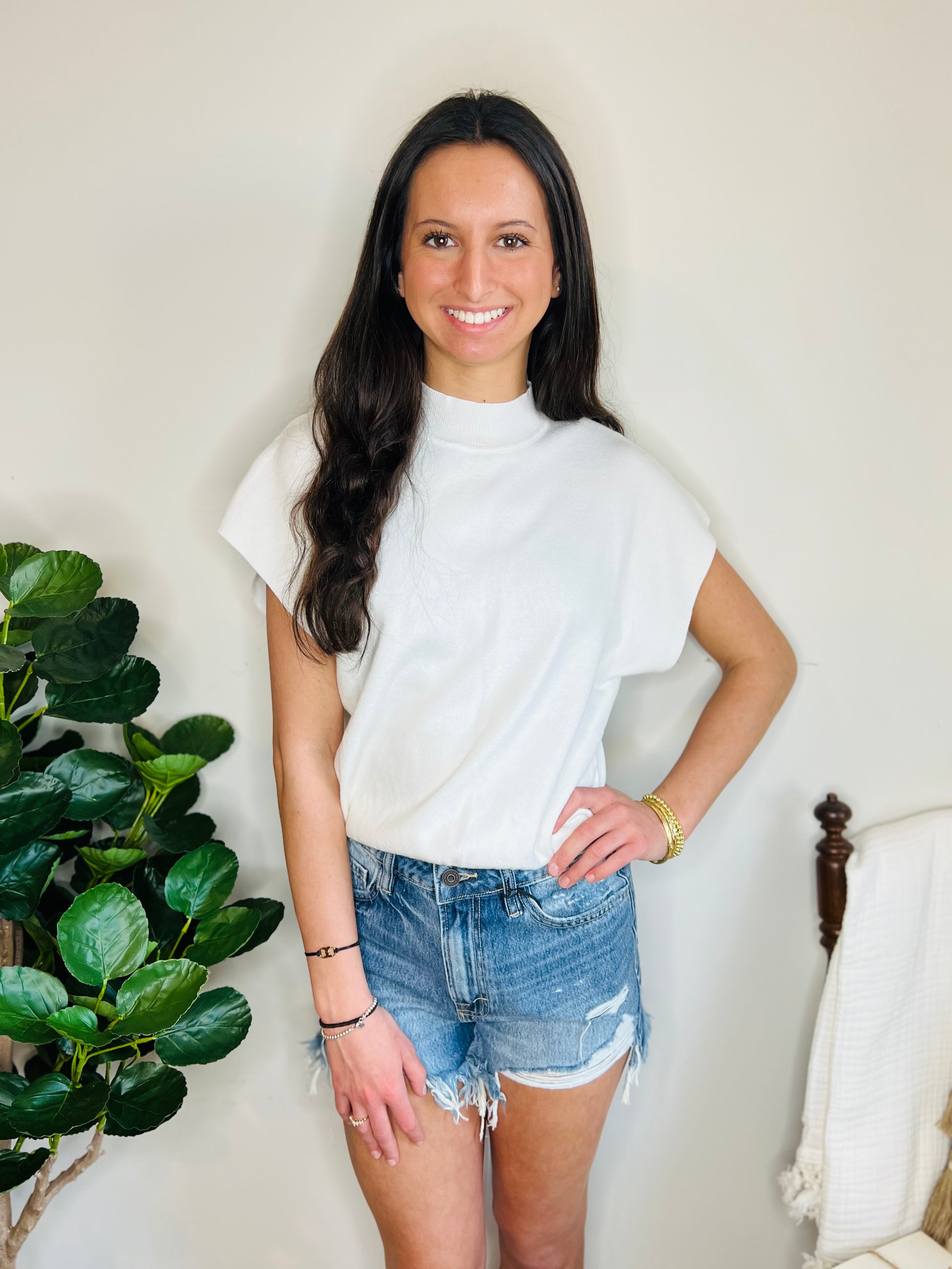 Basic white at its best! This one is the perfect simple addition to your wardrobe. It’s adorable worn with denim shorts, but can easily be dressed up with the right pants and accessories. This top features a ribbed texture, capped sleeves, and a mock-neck that makes it so feminine and flattering. Layer it with a fitted long sleeve top on cooler days for a year-round staple.