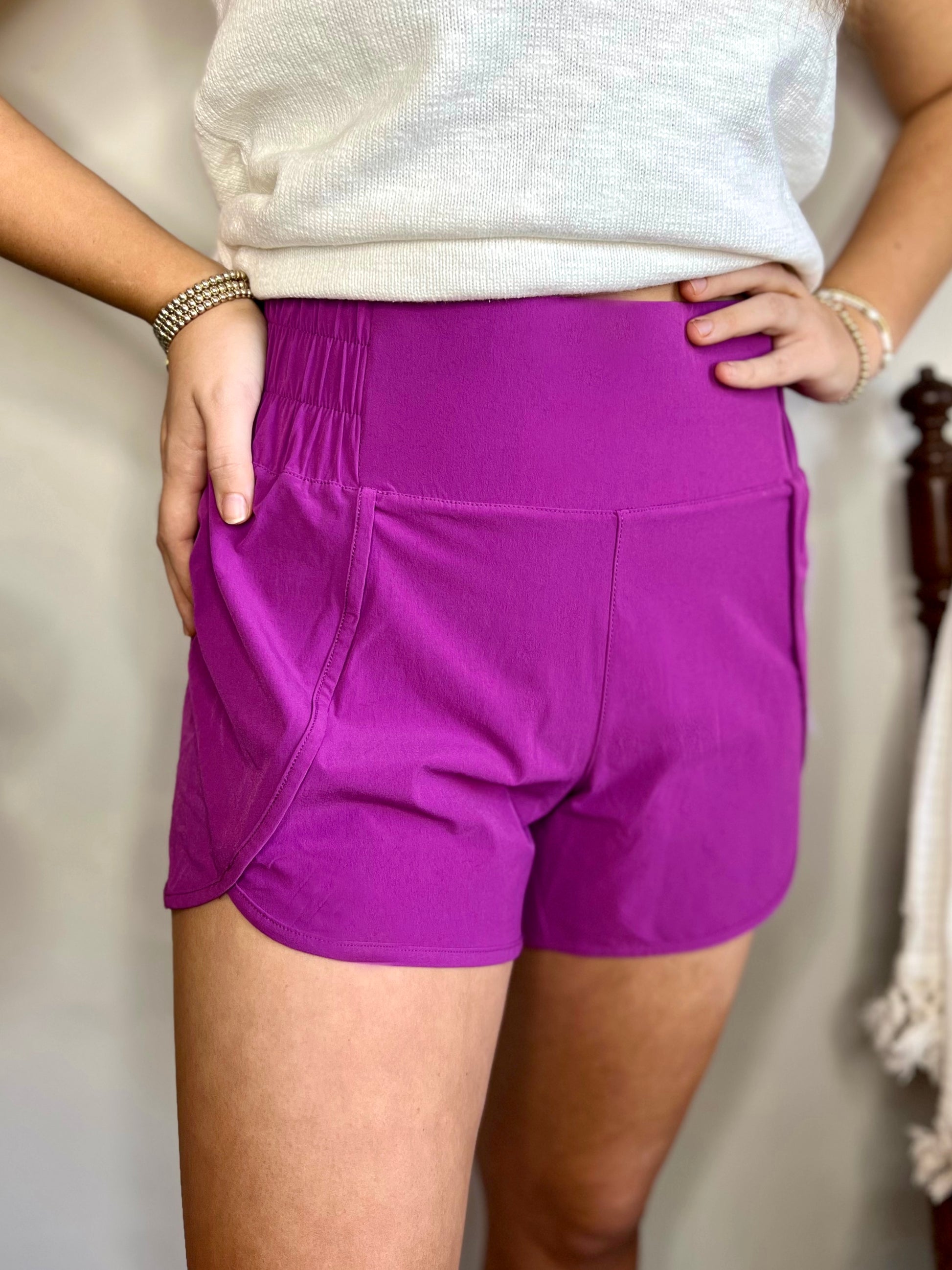 These vibrant jewel-toned athletic shorts will look great with all of your athletic tops. The thick, front panel offers tummy control, while the rest of the waistband is elastic for extra comfort and an ideal fit.