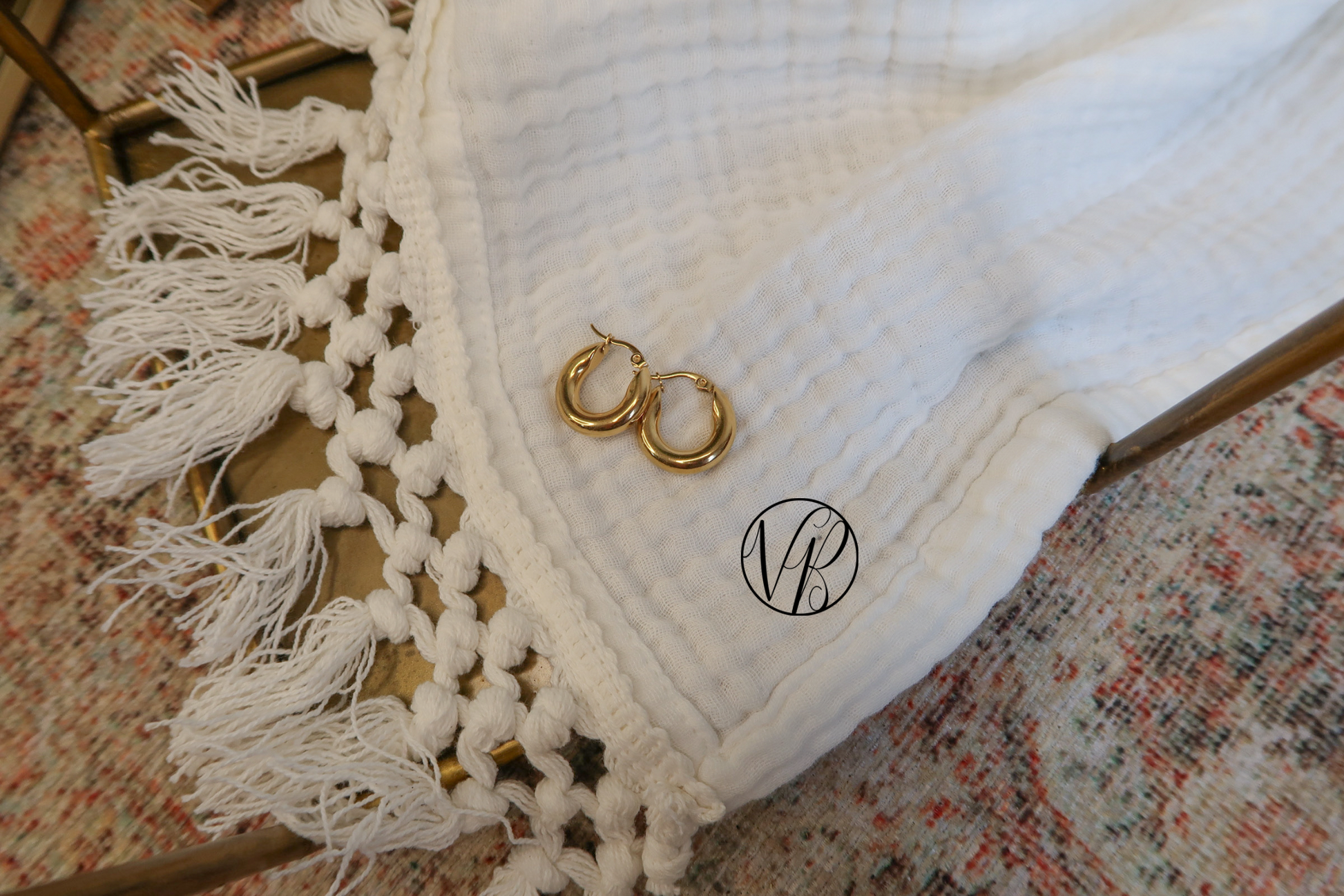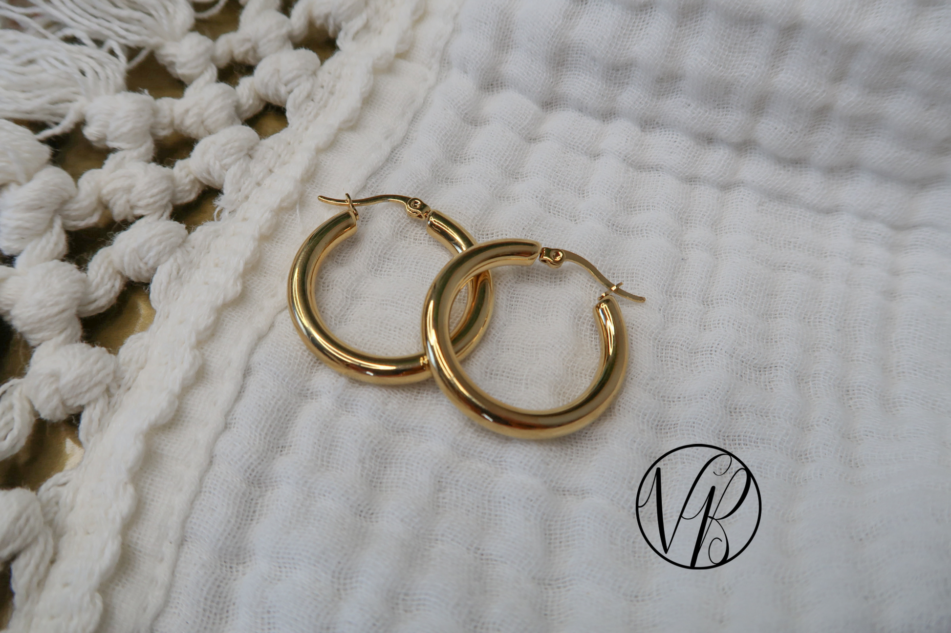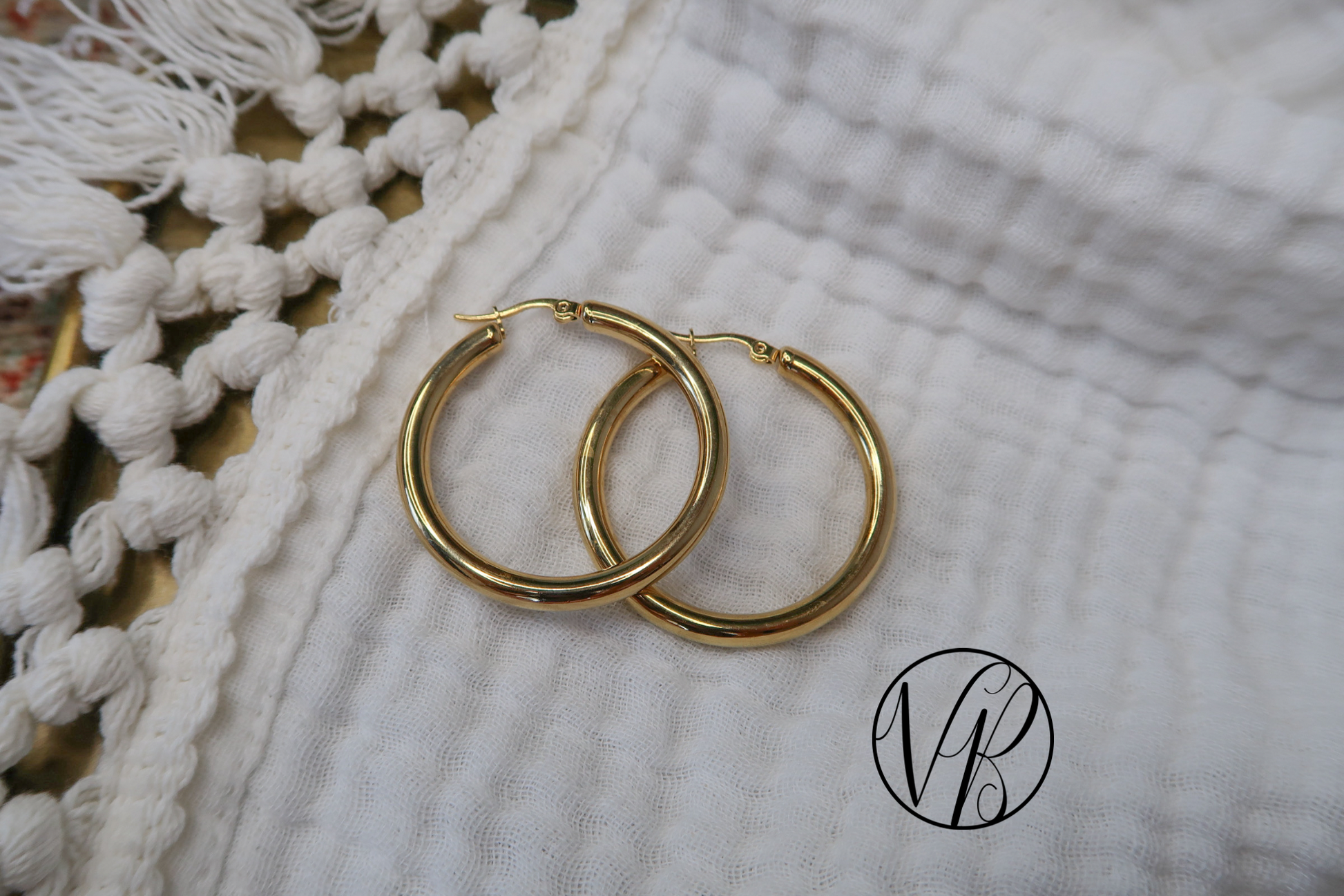 18k Gold PVD Plated Simple Circle Hoop Earrings. Non-tarnish Stainless Steel. These classic hoops are easy to wear with any outfit! 3 sizes available.