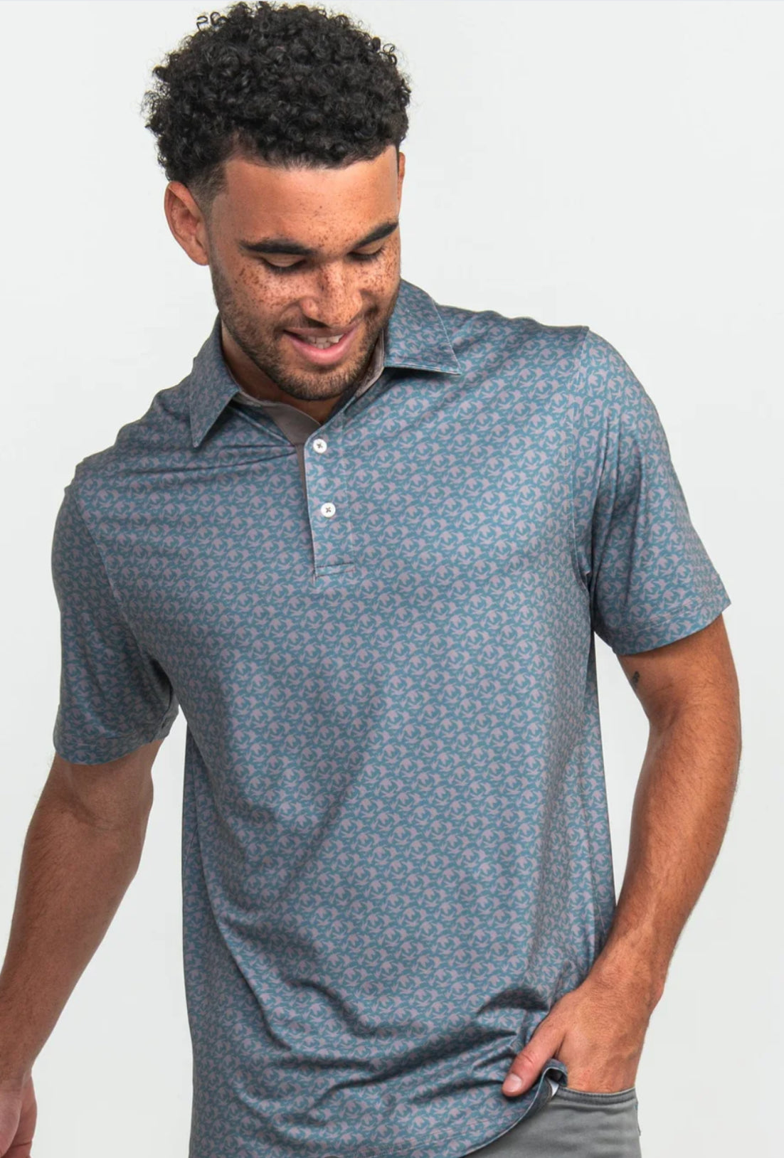 This unique printed performance polo is crafted from moisture-wicking stretch knit material that’s cooling and soft!