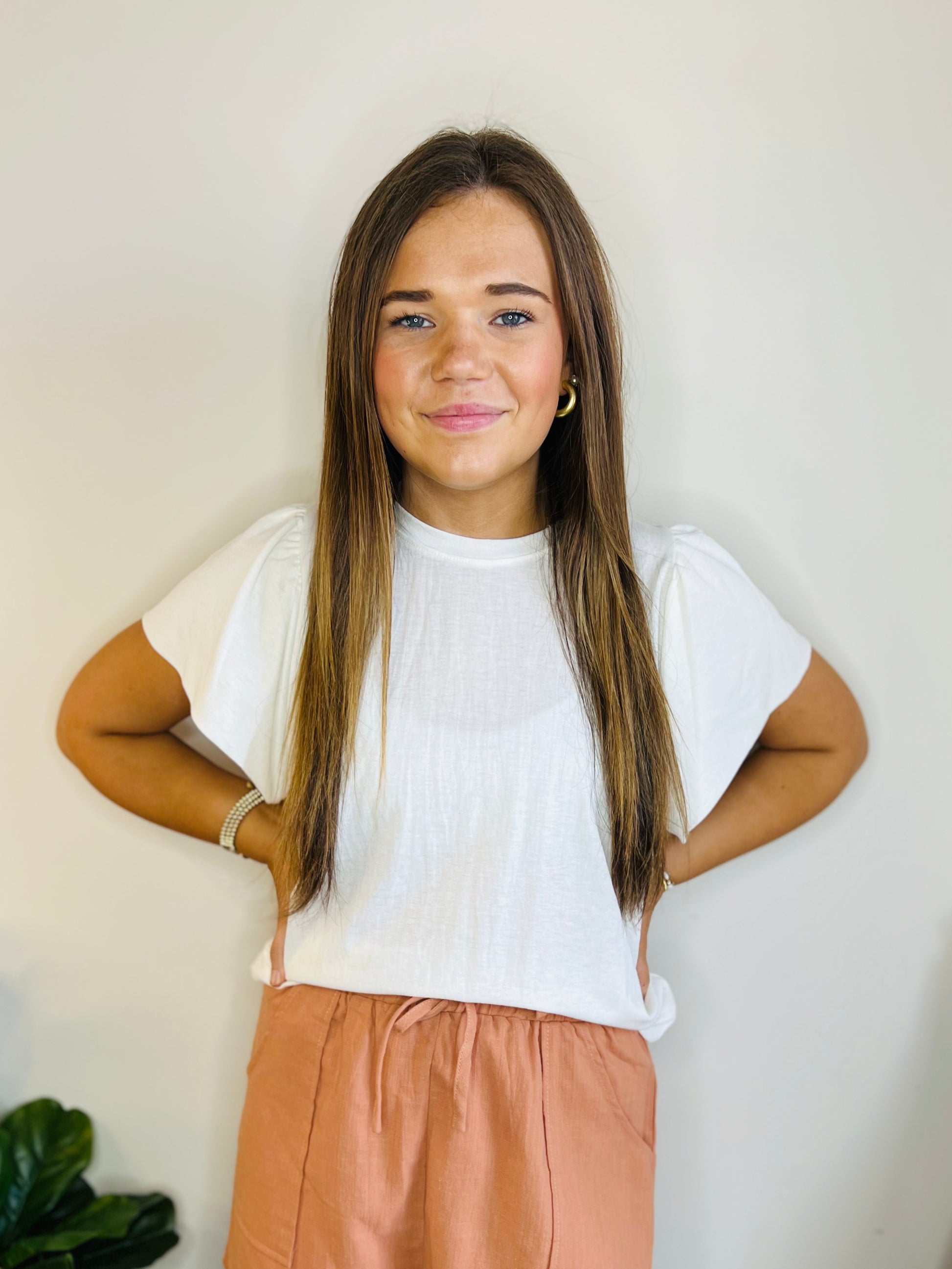 Look no further for the best basic white top! This one is made of a super soft fabric and is lightweight and cool. The flutter sleeves add such a pretty, feminine detail. We love the versatility in styling this top from casual to dressy, with almost any pants, shorts or skirts. Layering is an option with this one, as well. We think it would be adorable under a sleeveless romper or jumpsuit!